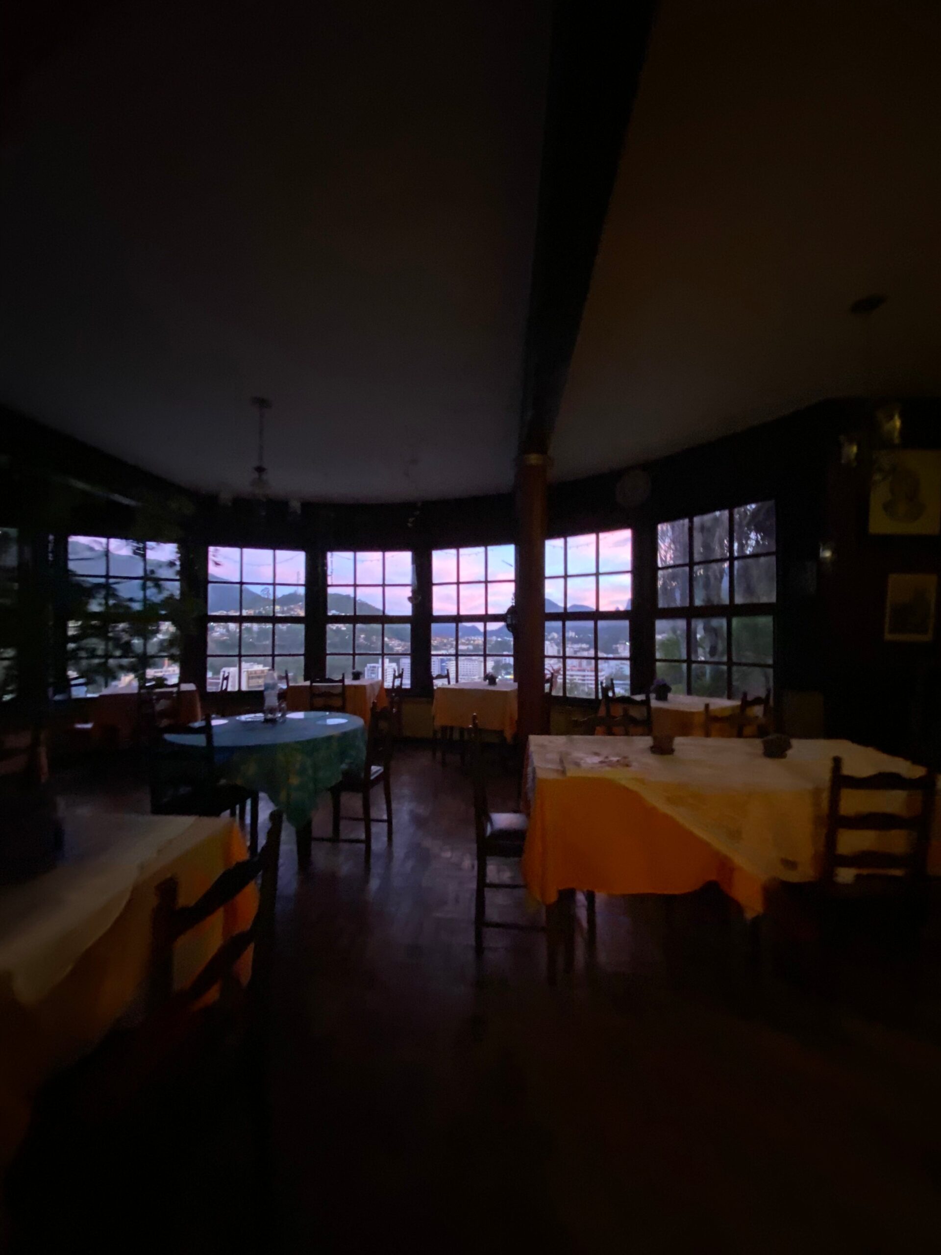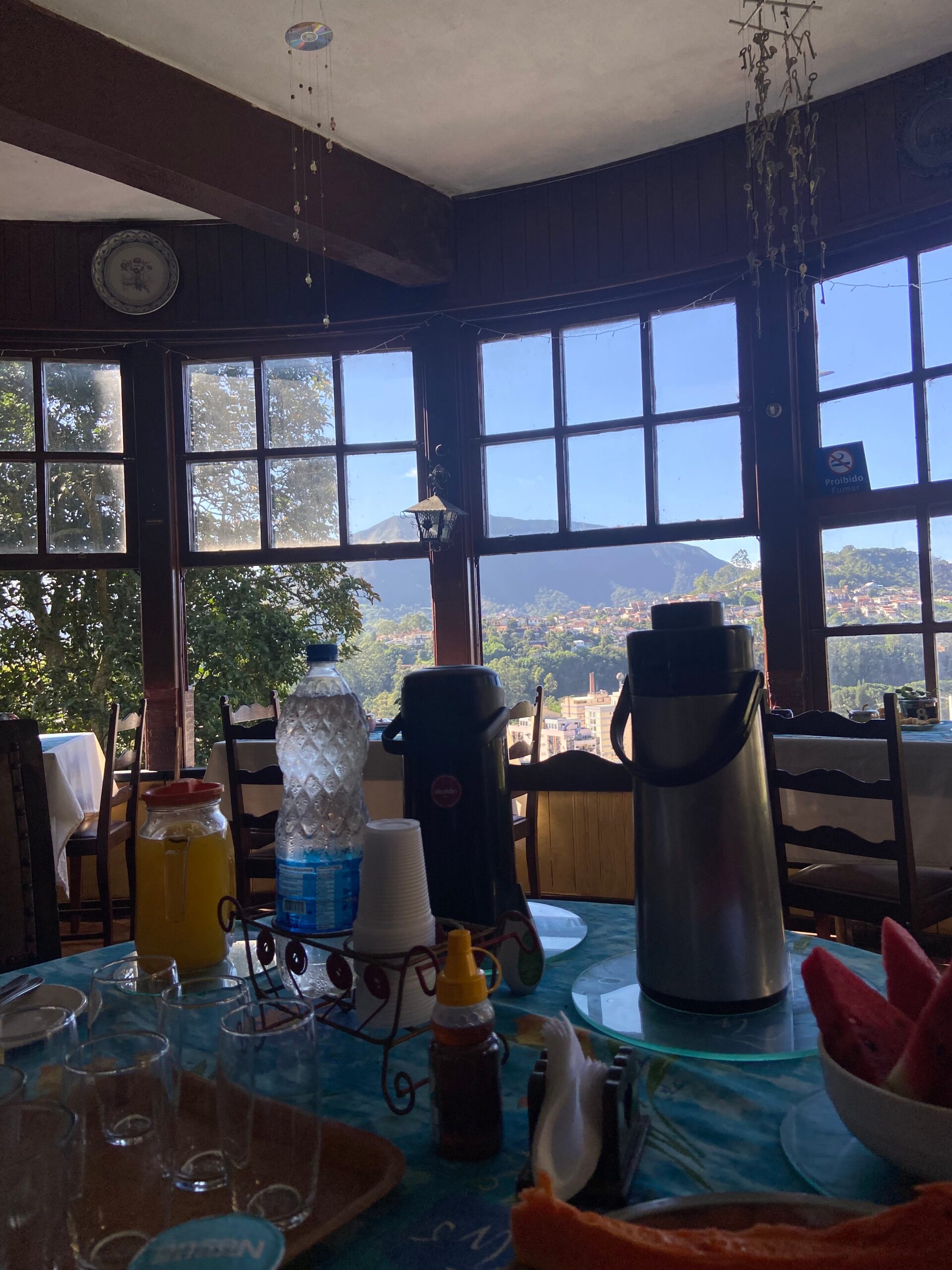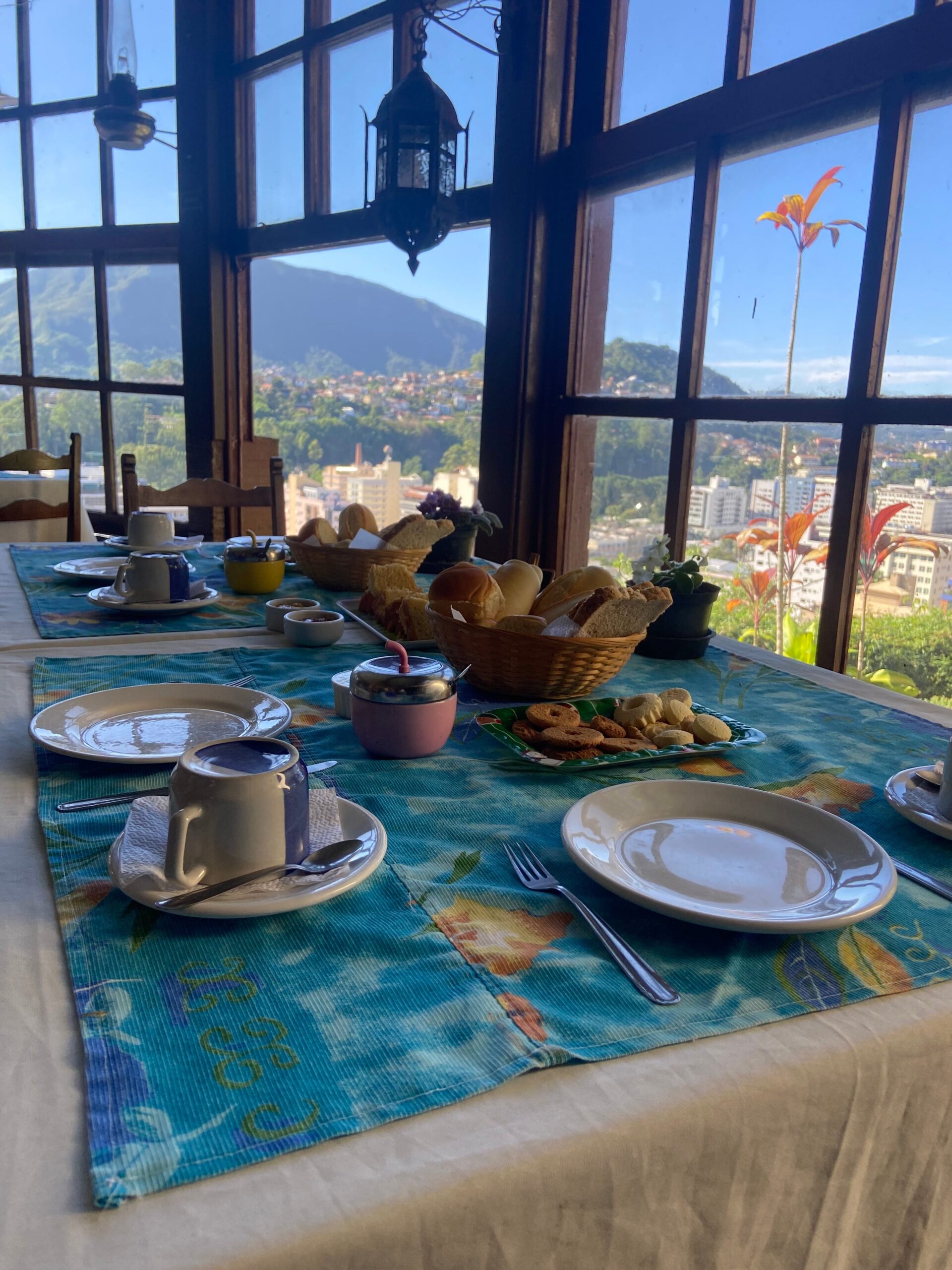 Contamos com um delicioso café da manhã servido no salão com vista para cidade e Serra dos Órgãos.