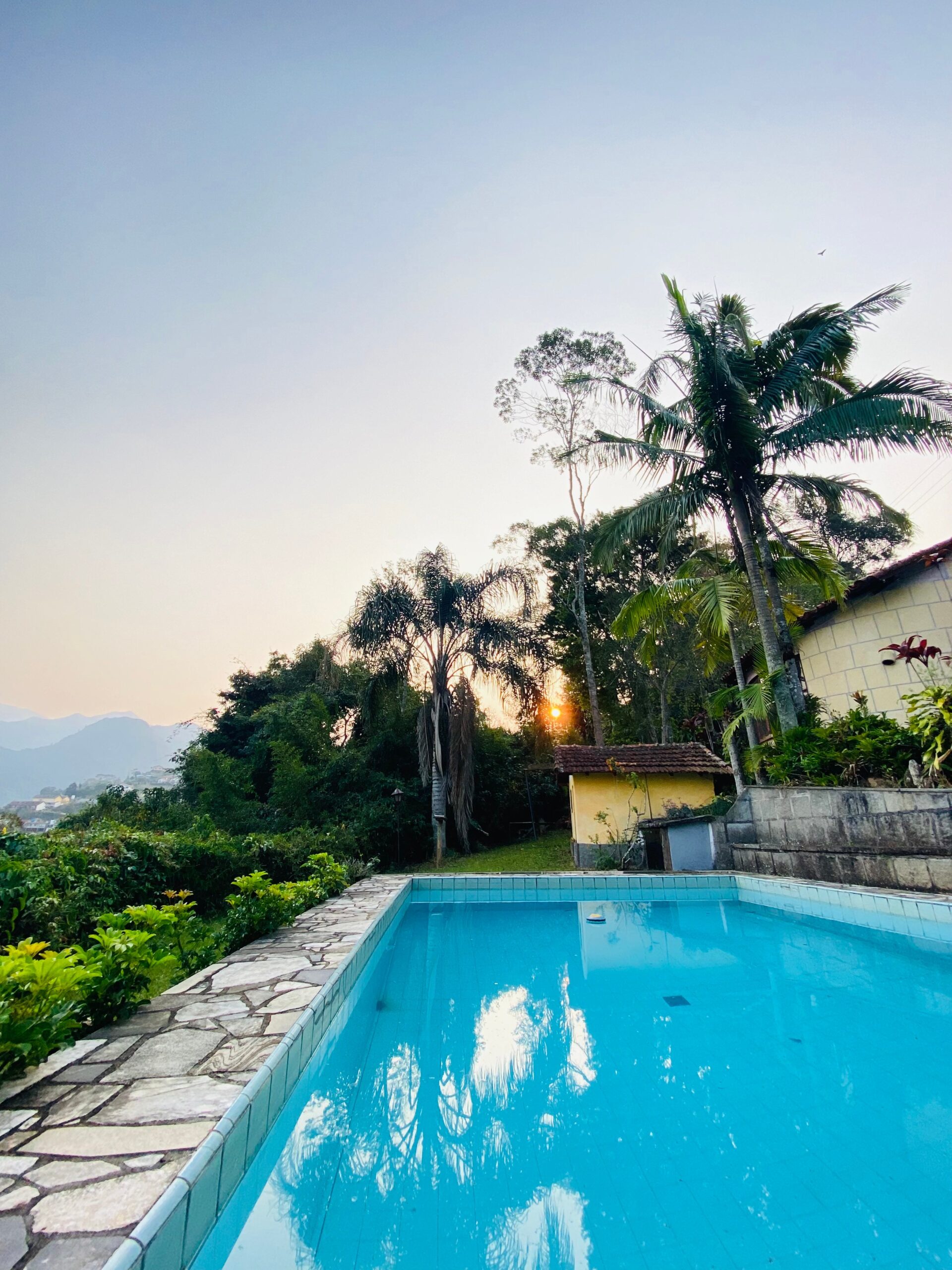 Possui vista ampla da piscina, cidade e Serra dos Órgãos.